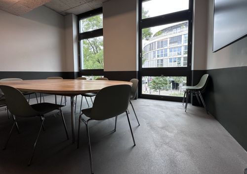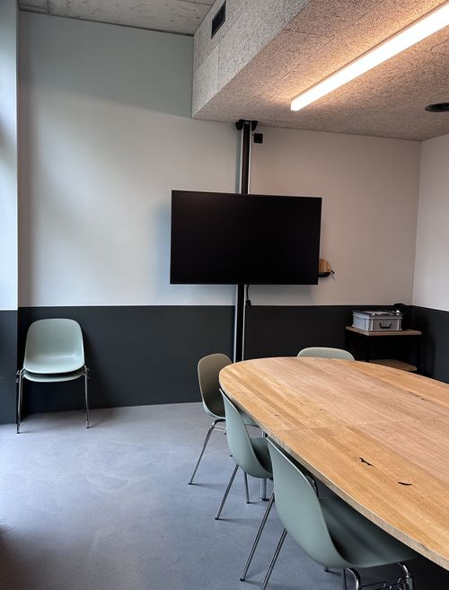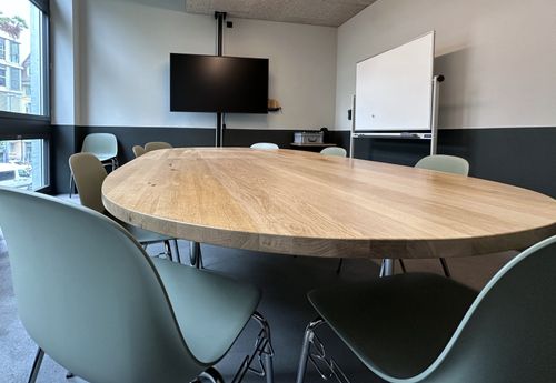 Für kurzfristige Teammeetings oder ganztägige Besprechungen im kleinen Kreis eignet sich dieser helle Raum mit drei raumhohen Fenstern zur Zollstrasse. 2 Stunden Mindestbuchung.